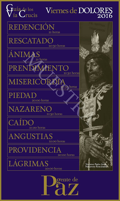 Hermandad de la Estrella: Solemne Vía Crucis de Nuestro Padre Jesús de la Redención a las 21:00 horas con el siguiente recorrido: Salida, Joaquín Sama Naharro, Colombia, Marqués de Guadalcázar, Goya, Sebastián de Benalcázar, Avenida Tenor Pedro Lavirgen, Fuente de los Picadores, Pintor Palomino, Goya, Buenos Aires, Fuente de los Picadores, Colombia, Joaquín Sama Naharro y Entrada al Templo.