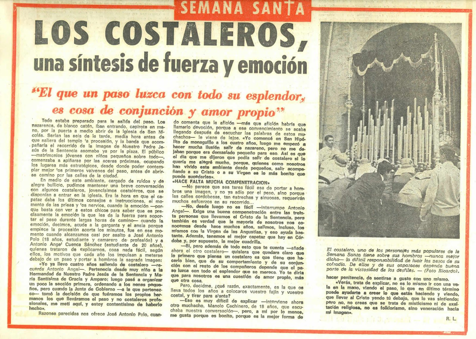 Sin embargo, en un momento como el presente en que la figura del costalero ha adquirido tanta relevancia y acapara tantos titulares – a menudo ligados a grandes polémicas – resulta especialmente curioso recrearse en las palabras de aquellos jóvenes, quienes con tanta claridad apelaban al trabajo en equipo – no solo entre ellos sino también con el capataz al que calificaban como el mejor de toda Córdoba – así como al indispensable sentido penitencial y por supuesto a la devoción tan necesaria y sin la que todo esto carecería de sentido.